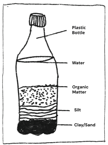 - The soil will settle in layers: dark bits on the top (like organic matter), fine soil in the middle (like silt), and heavy stuff at the bottom (like sand or clay).