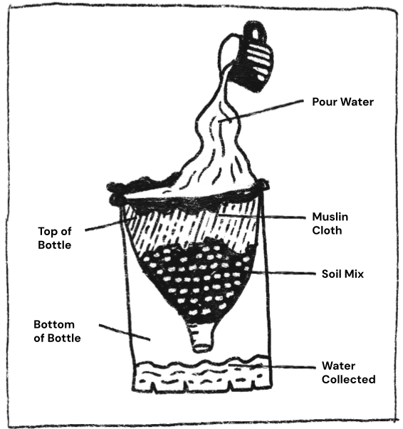 - Place this over another container and carefully pour water on the mix. Make sure you don’t end up flooding the soil mix too much!